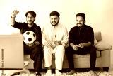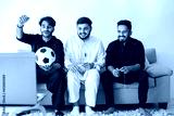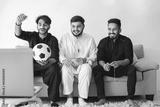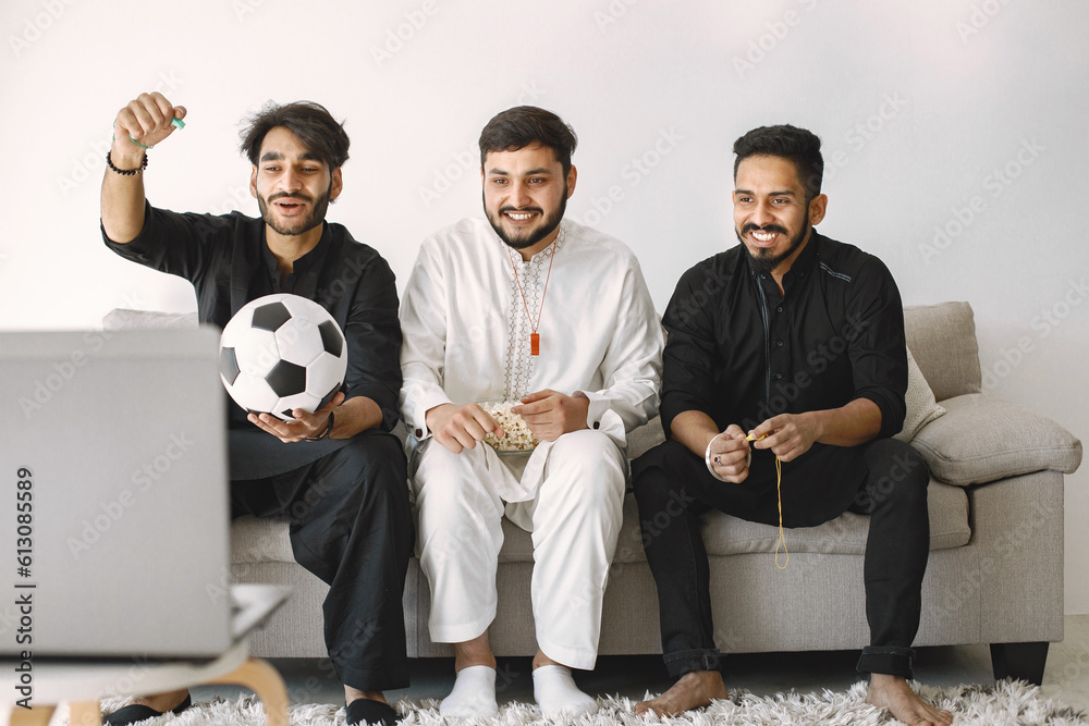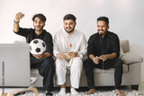 Three indian men sitting on a coach and watching football on laptop