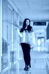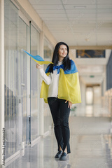 Brunette young woman with big Ukrainian flag standing and posing for a photo