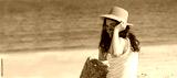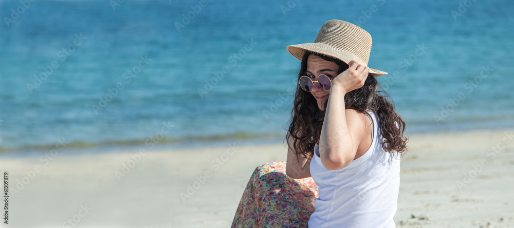 girl with hat and sunglasses sitting on the beach looking at the sea