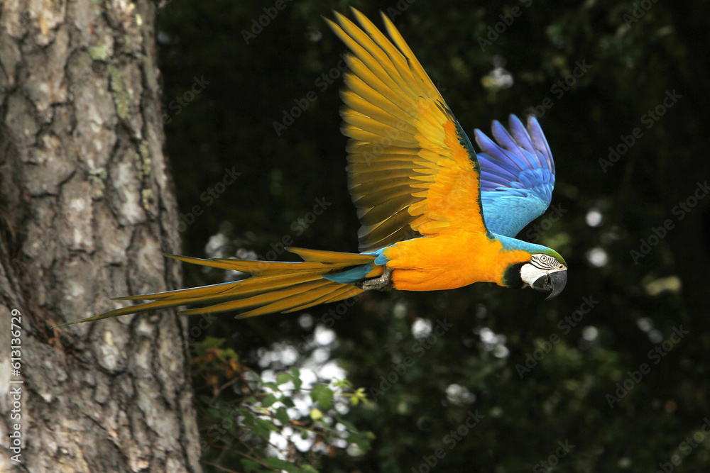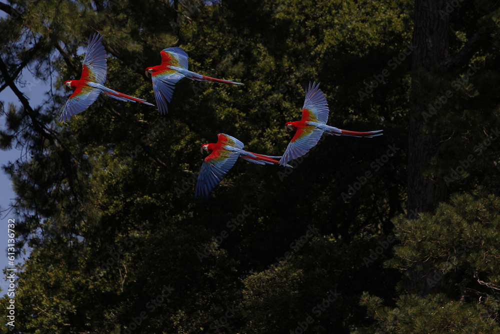 Red-and-Green Macaw, ara chloroptera, Group in Flight