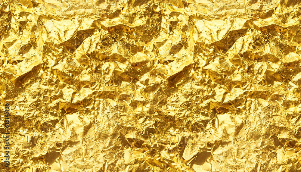 Shiny golden yellow crumpled metallic foil repeat pattern. Modern abstract luxury gilded age wallpaper.