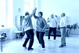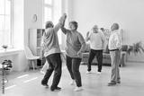 Happy retired senior people having a party, dancing and having fun together. Elderly men and woman dancing at home or in a retirement community center. Old age and leisure concept
