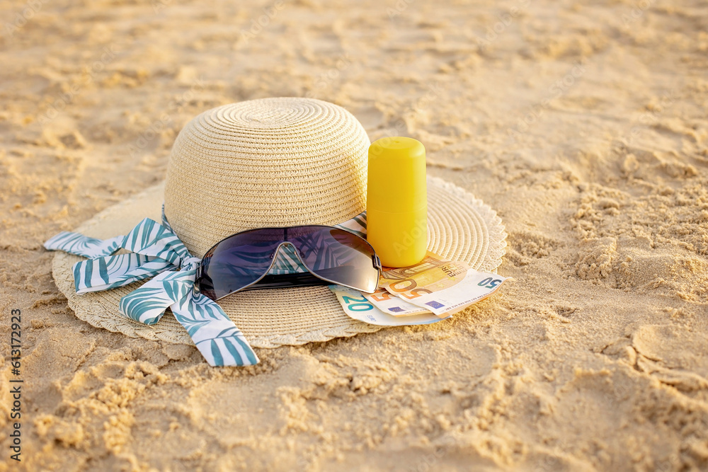 Vacation time - straw hat, sunglasses, suncream and money, ready for a holiday