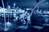 Cute child, boy, playing with water in fountain in Tel Aviv