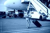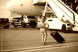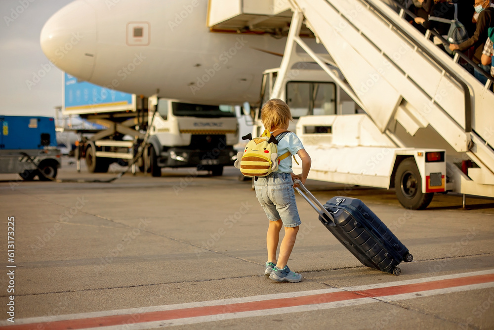 Cute blond child, kid with backpack, boarding airplane at the airport on sunset, enjoying the view