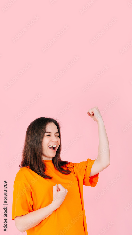 Triumphant Elation: Young Woman with Exuberant Expression, Raised Fists, Celebrating Success in Business. Vibrant Energy, Achievement, and Victory Concept. Isolated on Pink Background