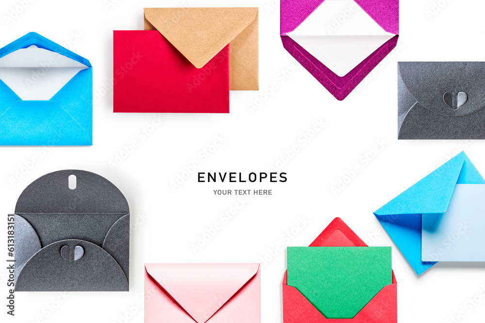 Envelope with blank paper card frame border isolated on white background.