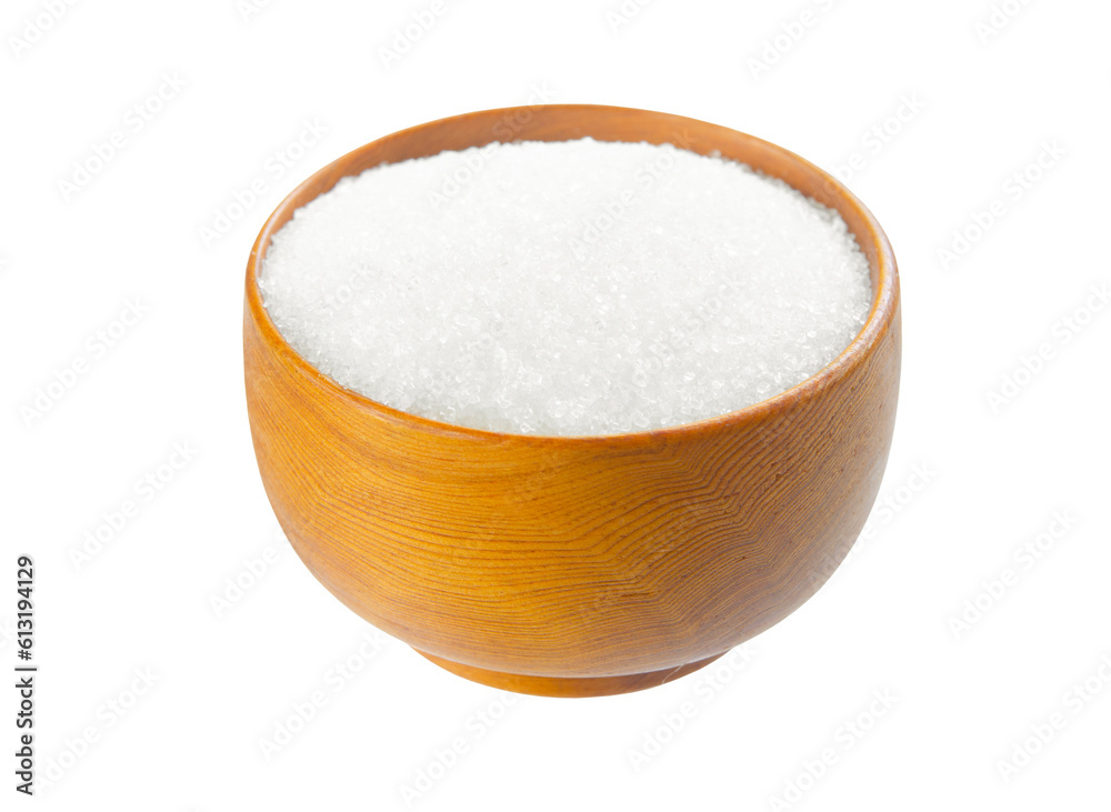 A wooden cup with sugar granulated isolated on white background, Save clipping path.