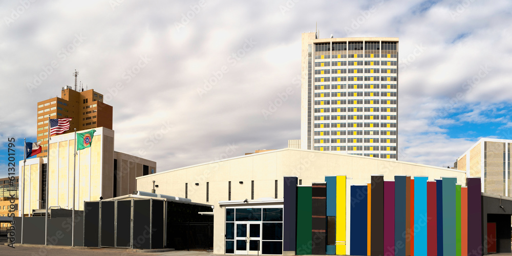 Modern city buildings in Midland with American and Texas State flags waving in the wind