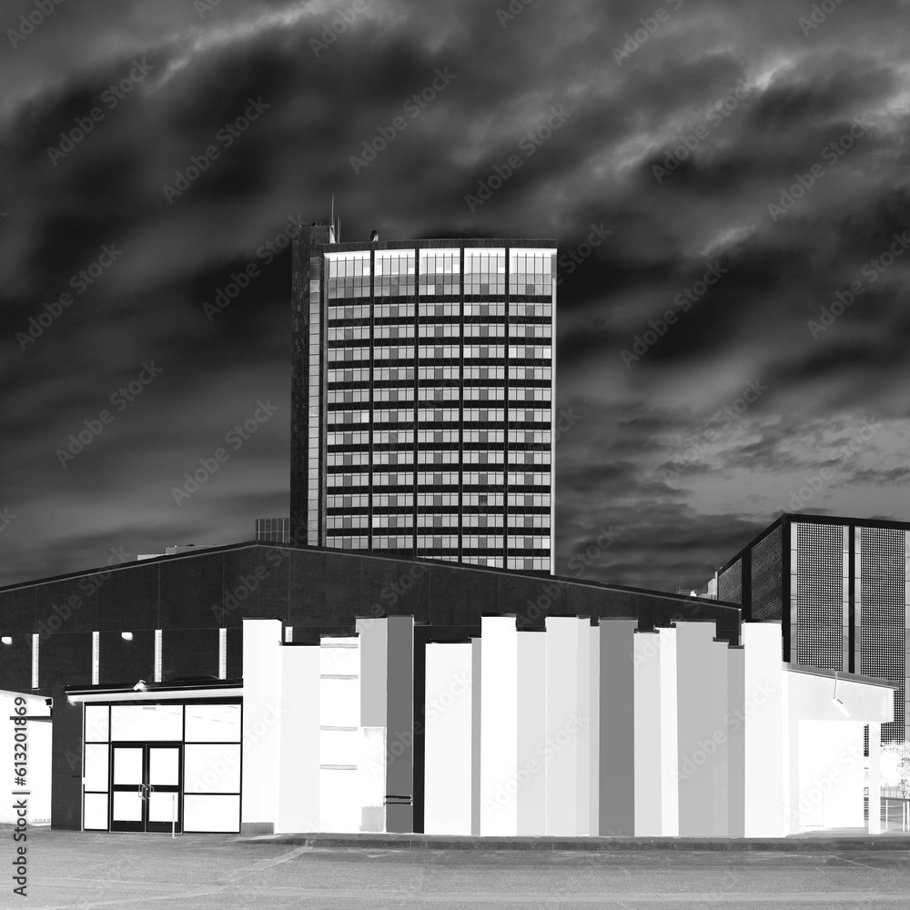 Monochrome cityscape at night. Black and white abstract geometry of modern urban buildings emphasizing light and shadow.