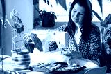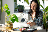 A woman sews tulle on an electric sewing machine in a white modern interior of a house with large windows, house plants. Comfort in the house, a housewife's hobby