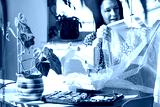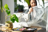 A woman sews tulle on an electric sewing machine in a white modern interior of a house with large windows, house plants. Comfort in the house, a housewife's hobby