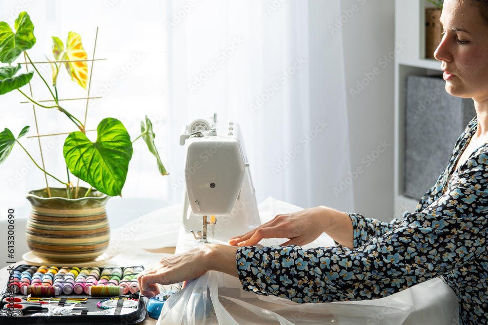 A woman sews tulle on an electric sewing machine in a white modern interior of a house with large windows, house plants. Comfort in the house, a housewife's hobby