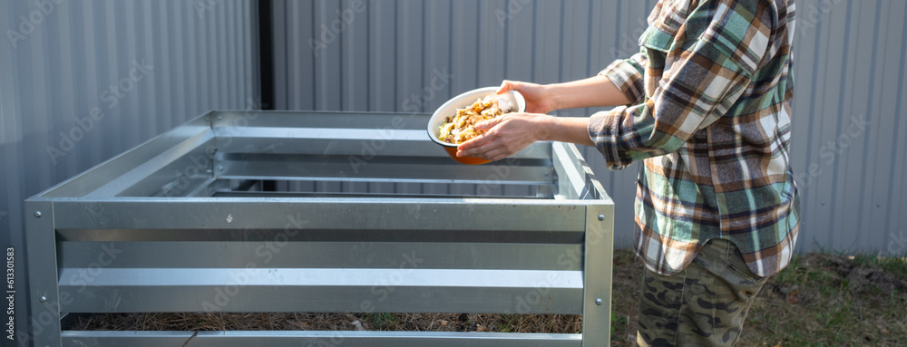 A woman in a plaid shirt pours food waste from a bowl into a compost heap of potato and carrot peelings. Compost box made of metal, eco-friendly fertilizer for the garden