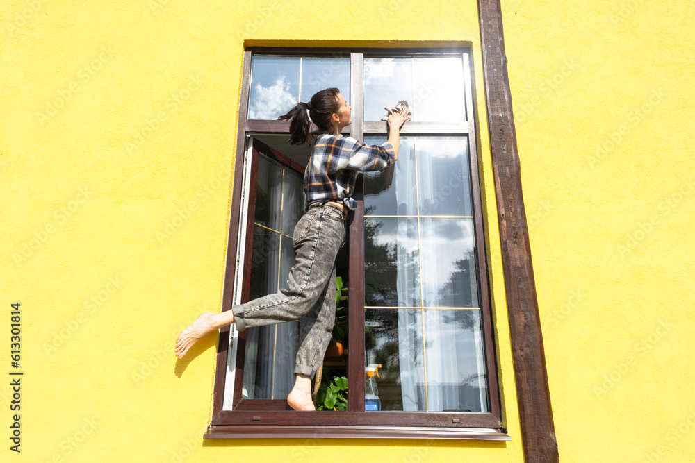 A woman manually washes the window of the house with a rag with a spray cleaner and a mop outside. Safety at height, restoring order and cleanliness in the spring, cleaning service