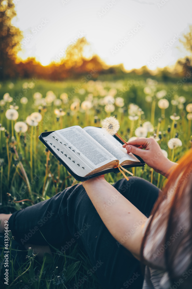 Christian woman holds bible in her hands. Reading the Holy Bible in a field during beautiful sunset. Concept for faith, spirituality and religion. Peace, hope