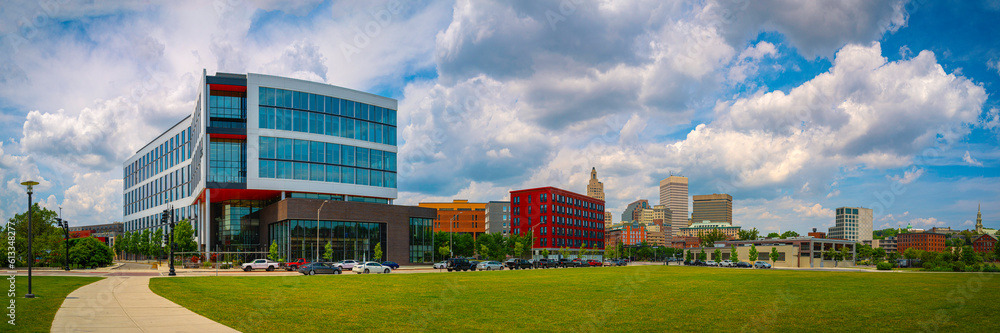 Modern office buildings, the city skyline, open green meadows, and dramatic cloudscape over the busy street in Providence, Rhode Island