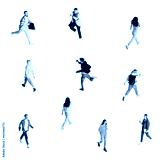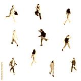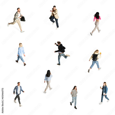 Conceptual design with different people, men and women walking to work, study or travel. Isometric view. Being busy. Concept of business, education, lifestyle, communication, social life, ad