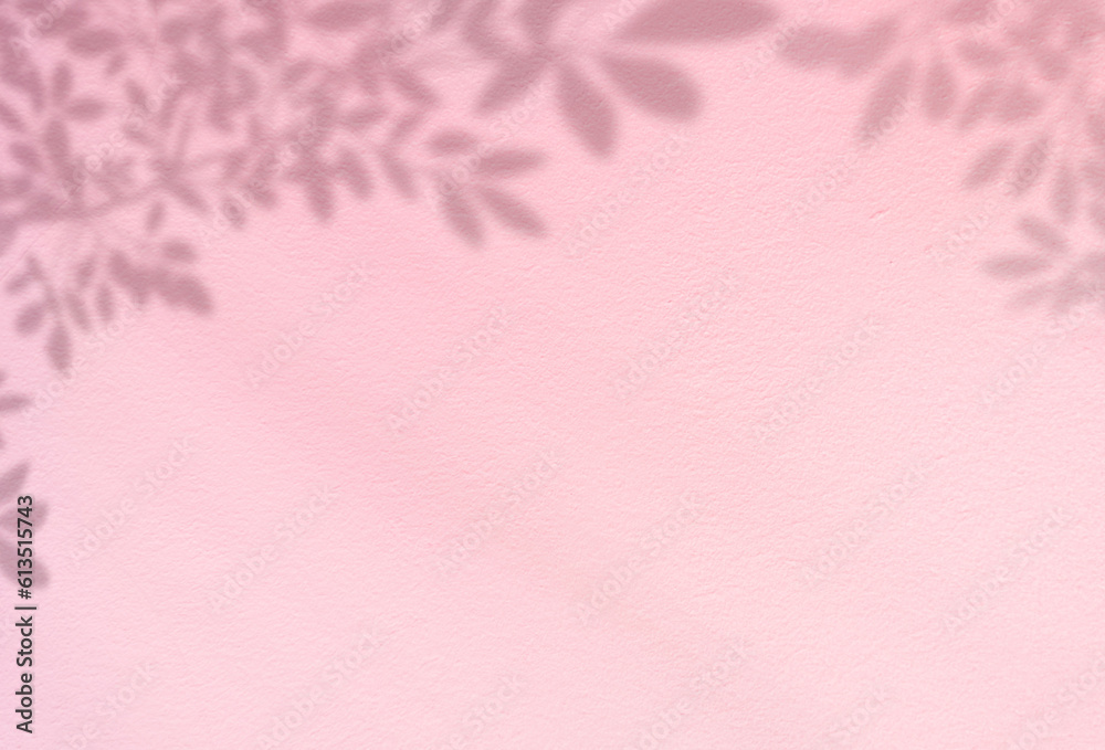 Pink Studio background with Leaves shadow on cement wall texture,Product Display room with branches leaves overlay on Pink pastel Concrete wall,Backdrop Banner for natural cosmetic product