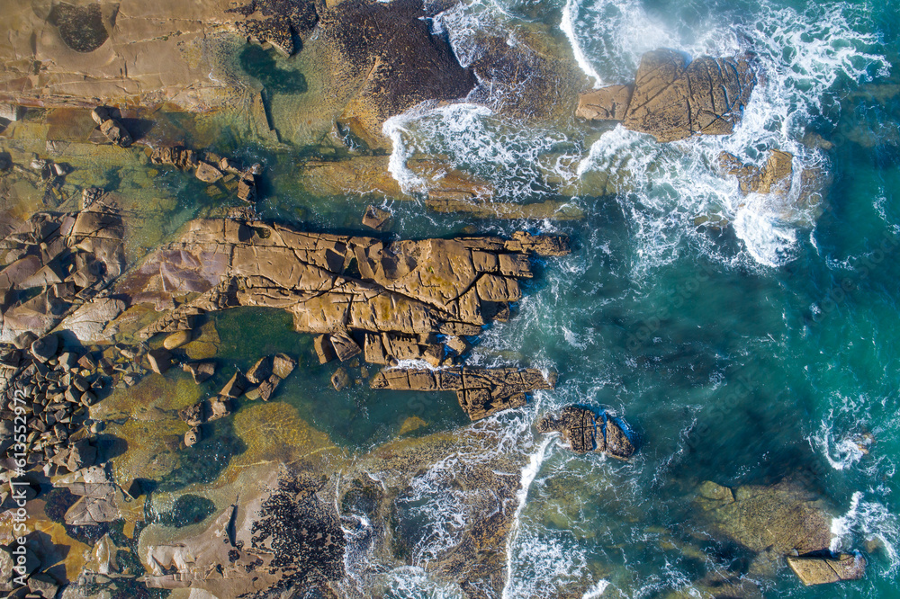 Aerial top view of sea waves crashing on a rocky shore, drone shot