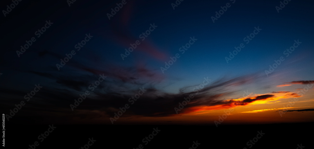 Natural dramatic landscape of beautiful colourful dark sunset or sunrise. Panoramic banner view.
