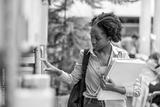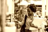 Black female student picking book from bookshelf in library