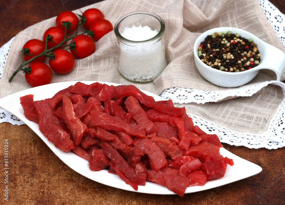 Rindergeschnetzeltes: In Streifen geschnittenes rohes Rindfleisch mit Tomaten und Gewürzen.