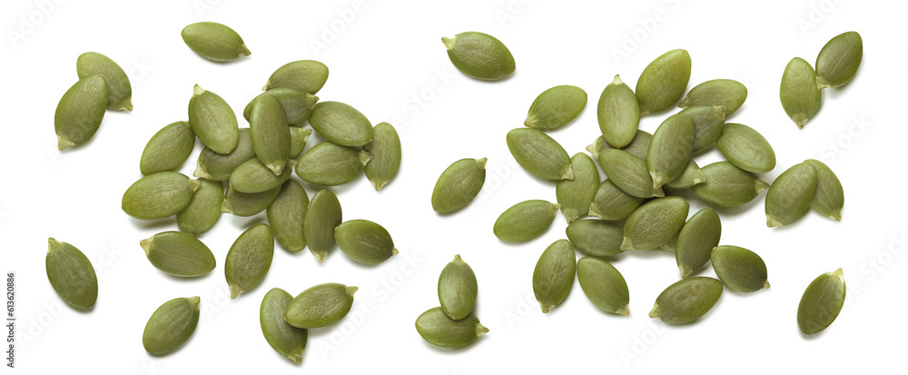 Green pumpkin seed set isolated on white background. Two piles of seeds
