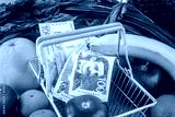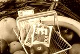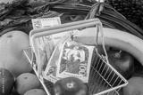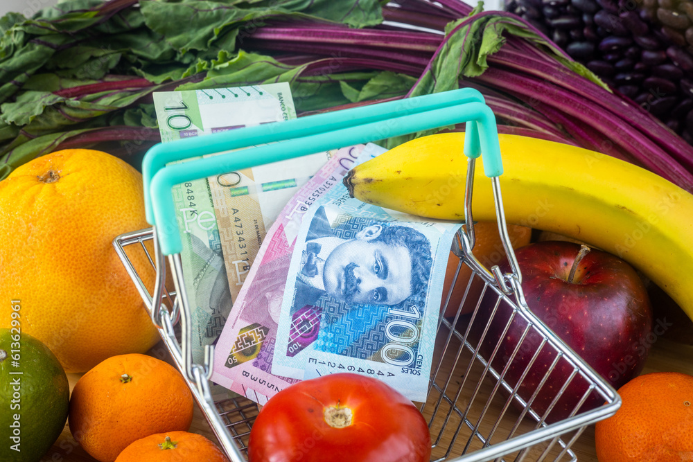 Peruvian money in a shopping cart, Vegetables and fruits, Concept, Rising food prices in Peru