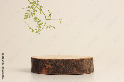 Wooden stump eco rustic platform podium on light background. Minimal empty display product presentation scene.
