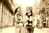 Happy older couple having fun walking outdoors in city. Retired people enjoying a sightseeing walk on street in spring. Mature couple relationships and vacations of pensioners.