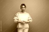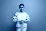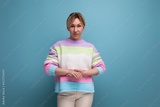 attractive blond young woman in pastel colored sweater smiling on blue background