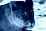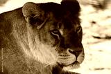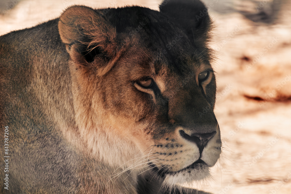 Lion female calm looking gaze, lionesses portrait, close-up with sandy blurred background. Wild animals, big cat