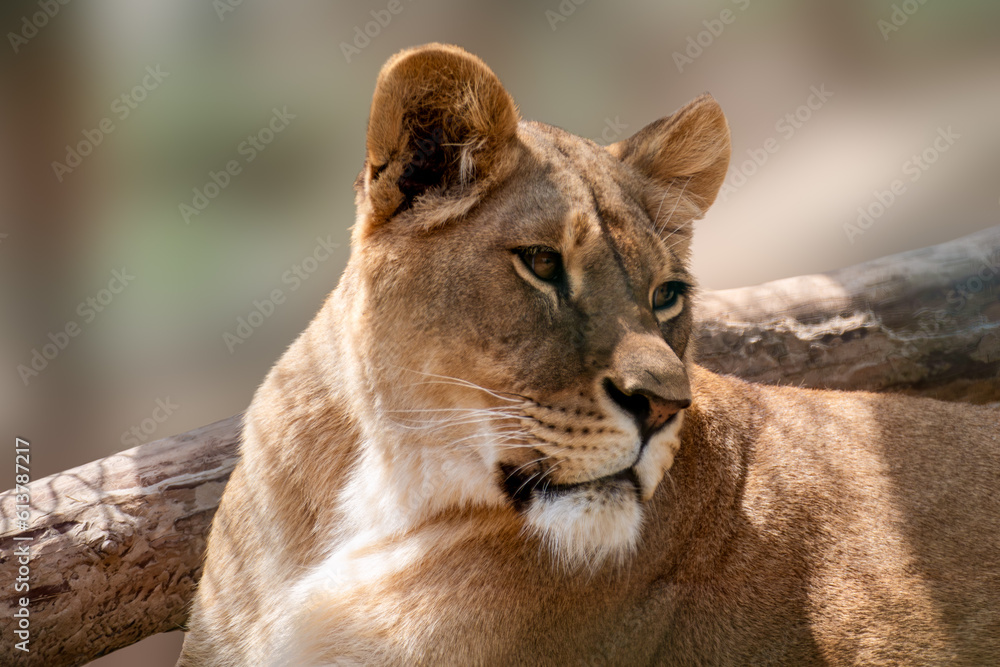 Lion female calm looking, lionesses portrait near tree, close-up on sandy blurred background. Wild animals, big cat