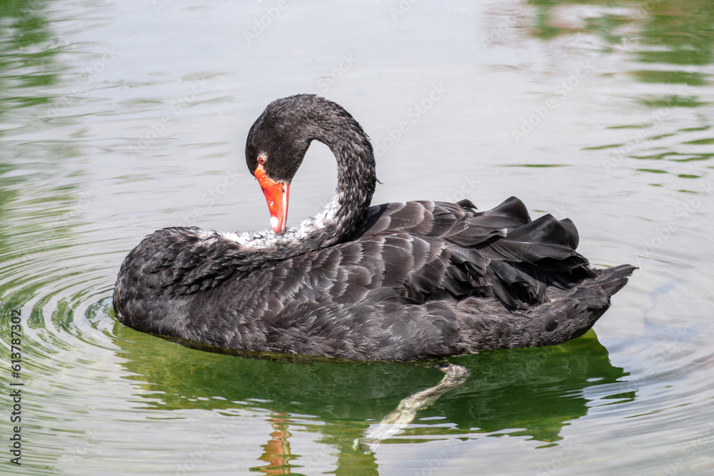 Black swan, large waterbird with a long flexible neck and red beak cleaning feathers on glossy green pond water surface with reflection. Side view