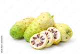 Noni or Morinda Citrifolia fruits isolated on white background (Rubiaceae Noni, great morinda, indian mulberry, beach mulberry, cheese fruit, Gentianales)