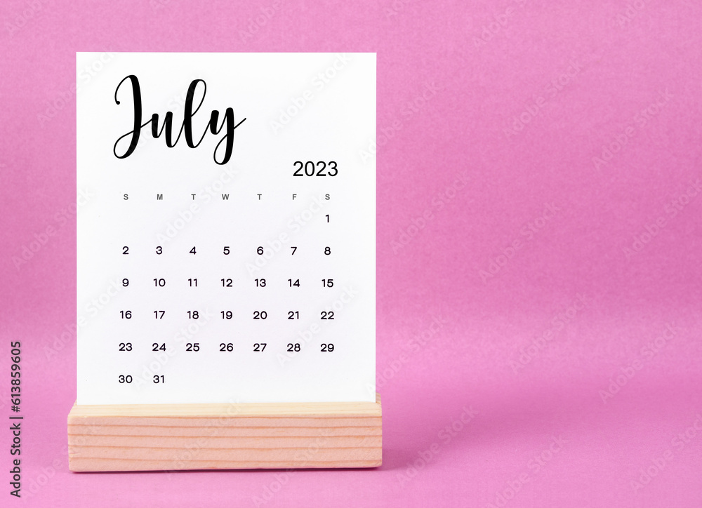 The July 2023 Monthly desk calendar for 2023 year on pink background.