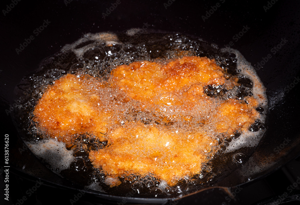 Breaded Fried Chicken. Foods fried in boiling oil in a Chinese wok. Cooking by frying in hot oil. Bubbles appear from frying