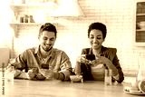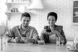 Happy multiracial couple in love, an african american woman and a caucasian man, using their mobile phones during morning breakfast together at home, watching online videos or news, messaging, smile