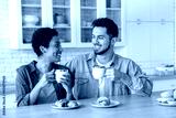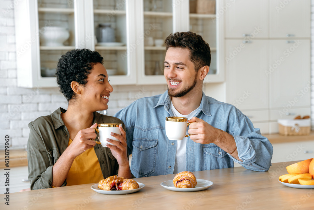 Joyful couple in love of different nationalities, happy spouses, sit und hugging at home in the kitchen, dressed in stylish clothes, drinking morning coffee with croissants, look at each other, smile
