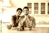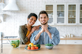 Photo of beautiful happy couple in love, caucasian man and african american woman, stand at home in the kitchen, cooked fresh healthy salad for lunch, look at the camera, smile. Multiracial couple