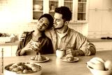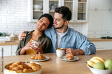 Happy spouses of different nationalities, sit und hugging at home in the kitchen, dressed in stylish clothes, drinking morning coffee with croissants, dreaming about something, look away, smile