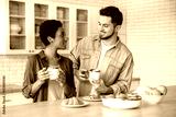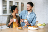 Happy spouses of different nationalities, stand at home in the kitchen, dressed in stylish clothes, drinking morning coffee with croissants, discussing plans for the weekend, look at each other, smile