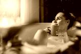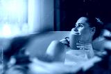 woman relaxing in bath and drink a coffee at home bathroom. looking out of window