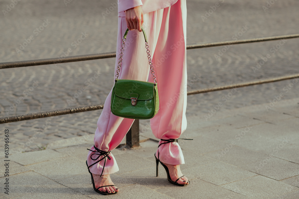 Street fashion details: woman wearing trendy pink suit trousers, high heeled strap sandals, carrying green color faux reptile leather bag. Copy, empty space for text