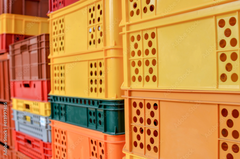 Stack of colorful plastic crates or boxes for transporting bakery and food products. Selective focus.