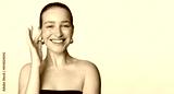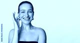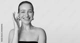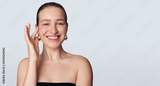 Happy young lady with perfect skin touching cheek and smiling