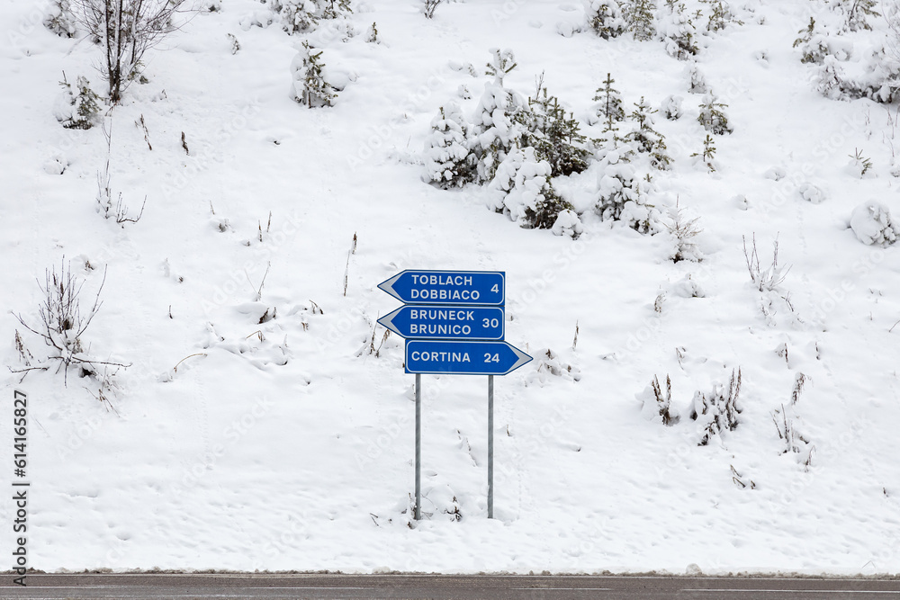 View of a road sign with directions to Cortina d'Ampezzo, Brunico, and Dobbiaco on a snowy winter day in the Dolomites, Italy