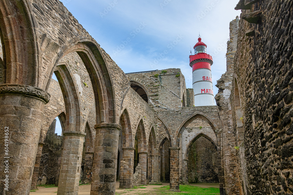 Panorama of lighthouse and ruin of monastery, Pointe de Saint Mathieu, Brittany (Bretagne), France