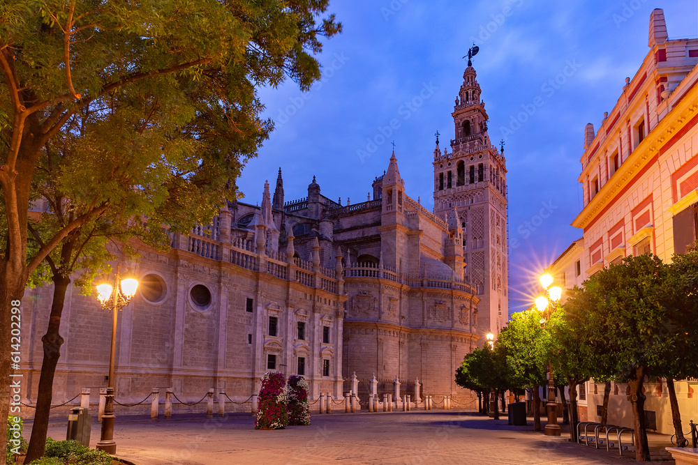 Famous Bell Tower named Giralda and Cathedral Saint Mary of the See at night, Seville, Andalusia, Spain